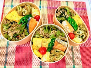 ②ハムタマゴ・卵焼き・豚バラ肉の高菜炒め・焼き鮭・ほうれん草の和え物・ちくわ磯辺風・プチトマト